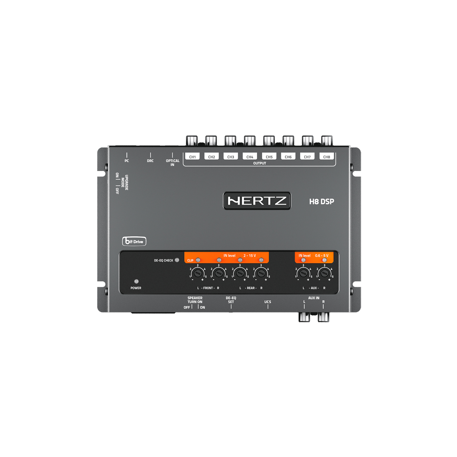 پروسسور H8_DSP دارای ۷ ورودی سیگنال (۴ ورودی سطح بلندگو/پیشتقویتشده، ورودی AUX استریو و ورودی دیجیتال نوری با پشتیبانی 96 kHz/24 bit) است و ۸ خروجی پیشتقویت (PRE OUT) با امکانات زیر را ارائه میدهد: